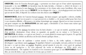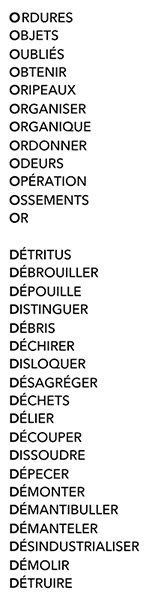 En me laissant guider par le hasard j’ai sélectionné une série de mots commençant tous par O – R – D ou E et me semblant liés à l’histoire du lieu et de son activité. Ces mots, affichés sur des lais à l’extérieur, encadraient la façade et étaient ensuite repris sur des affichettes. Chacun de ces mots était ensuite recyclé dans une courte définition, de manière à en faire émerger images et idées neuves.