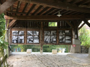 Sur les panneaux à claire voie de la tannerie sont installées 16 photographies en noir et blanc réalisées au moulin Huteau à Corbeil-Essonnes. Entre les panneaux et le sol, un espace vide crée un cadre rectangulaire où l’on voit s’écouler l’Essonne, tel un écran de cinéma. L’image photographique en noir et blanc s’oppose par sa fixité au mouvement paisible de l’eau aux couleurs douces.