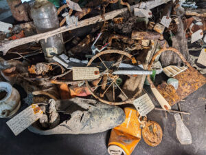 « Cette accumulation d’objets et de matériaux déversés sur une table présente aux visiteurs la diversité de ce que nous laissons comme traces de nos vies dans la rivière. Pour tenter de répondre à la question – mais ces objets, comment sont ils arrivés là ? – j’ai accompagné certains d’entre eux d’une courte histoire qui les situe dans une époque, un lieu de la ville et une situation singulière. Cette fiction propose d’expliquer comment et pourquoi, ils ont quittés notre quotidien pour finir dans le lit de la rivière. »